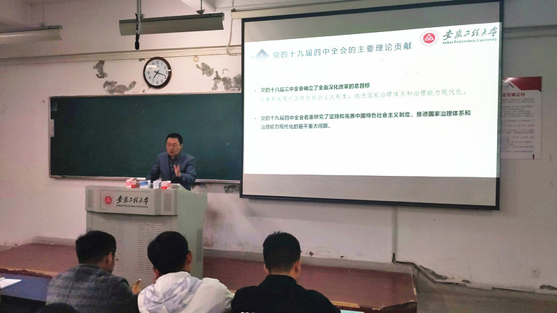 徐东辉从“党的十九届四中全会的主要理论贡献”“我国国家制度和理论现代化的主要考量”“我国国家制度和治理的基本逻辑”“我国制度和国家治理的特质和优势”四个方面由浅入深,逐步阐述党的十九届四中全会精神以及我国制度的优势。他指出,与党的十八大相比,党的十九届四中全会着重研究了坚持和完善中国特色社会主义制度,推进国家治理体系和治理能力现代化的若干重大问题。他强调,我们党把制度建设和国家治理问题的认识和实践提升到了前所未有的新高度,将“努力实现'两个一百年'的奋斗目标” “推进新时代改革开放”“三个一以贯之”作为主要考量,应对风险挑战,推进党的建设。他从五大体系入手,逐一分析我国国家制度和治理的基本逻辑。他在总结中指出,我国的治理并不是单方面的、几方面的优势,而是全领域的优势;不是一般的优势,而是显著优势;不是一朝一夕形成的优势,而是多年奋斗而来的优势;不是“平均用力”的优势,而是“党的领导”的优势。他希望同学们深入学习领会并认真贯彻党的十九届四中全会精神,用党的创新理论武装头脑,真正在学懂弄通做实上下功夫,争取早日加入党组织。