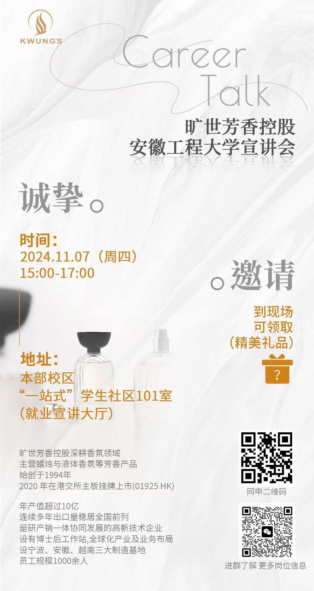 | 5 | 2024年11月7日下午15:00 | 一站式”员工社区101室(就业宣讲大厅) | 旷世芬香控股 | |