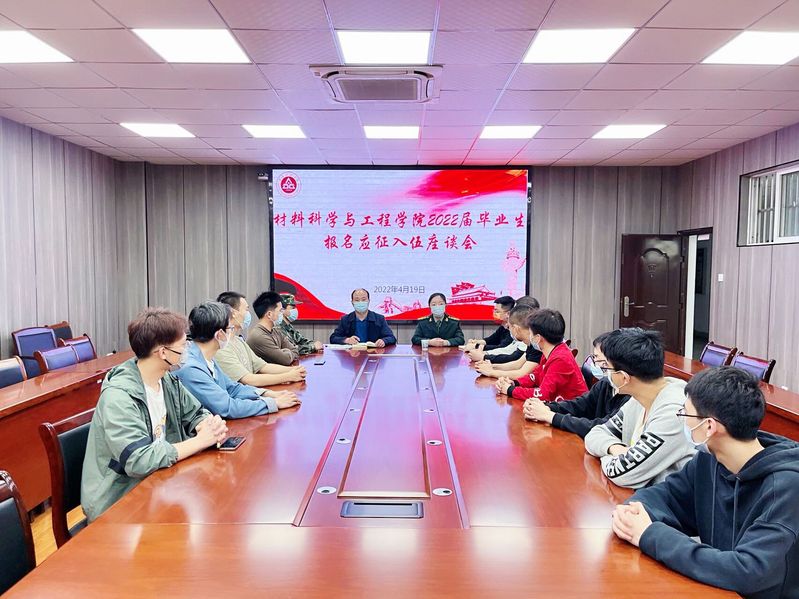 为响应国家号召,激发毕业生参军热情,材料学院于4月19日晚在B座216举办2022届毕业生报名应征入伍座谈会。会议由公司党委副书记方玖胜主持,保卫处征兵工作站赵成婧、退役复学学生侯玄玄、毕业班辅导员田园及报名应征入伍毕业生参加会议。