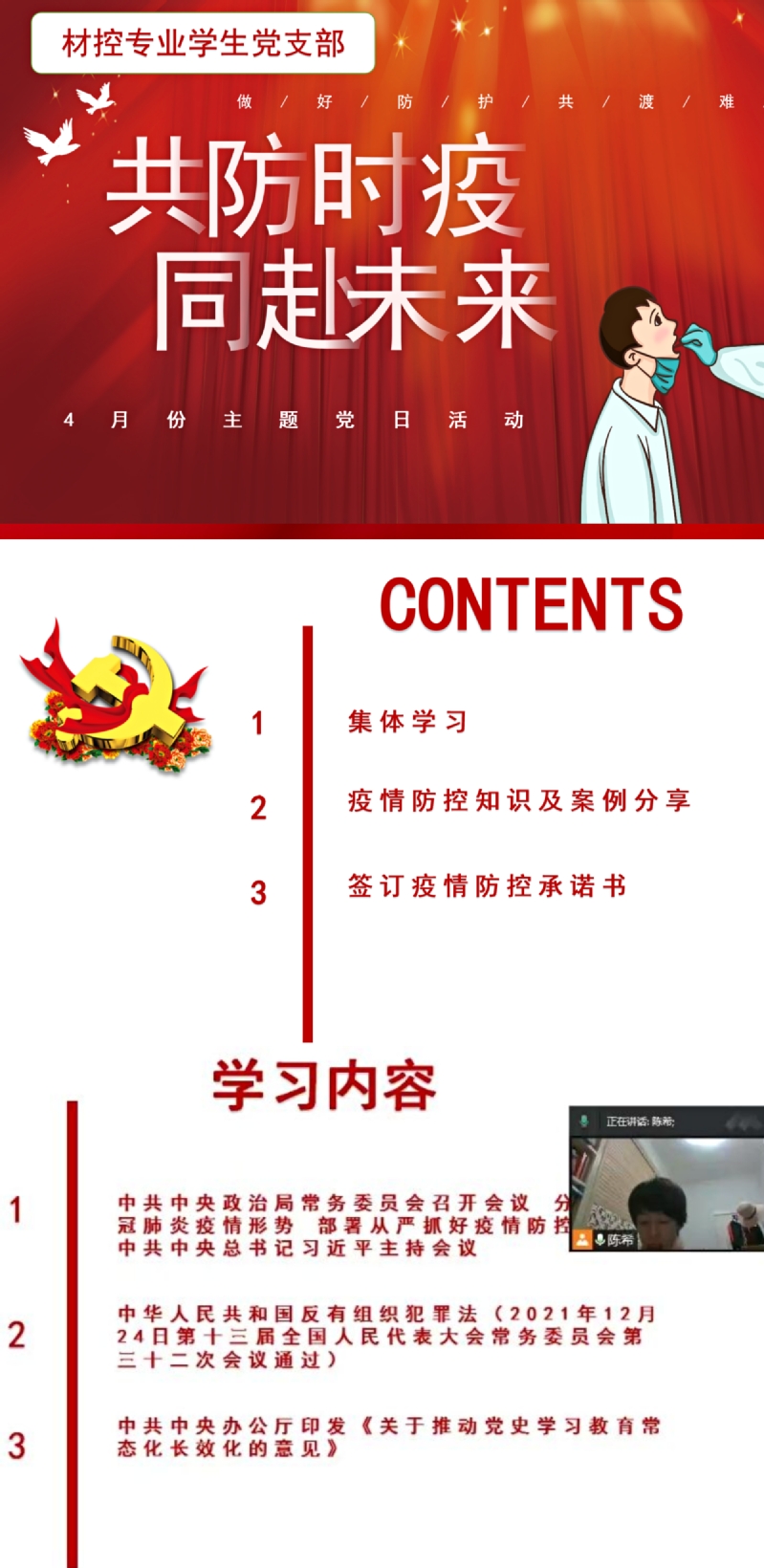 随后,陈希以疫情防控警示案例为例,提醒在校老员工在疫情防控的战斗面前,要服从公司管理,遵守各项规定,一定要承担起时代赋予我们的使命与责任。通过短视频《大白礼赞》向大家展示了在疫情防控期间,守护在我们身边默默奉献的平凡英雄们。最后,支部全体党员签订疫情防控承诺书,表示会与公司、辅导员以及同学们一起并肩作战,为打赢这场疫情阻击战,作出自己应有的贡献。