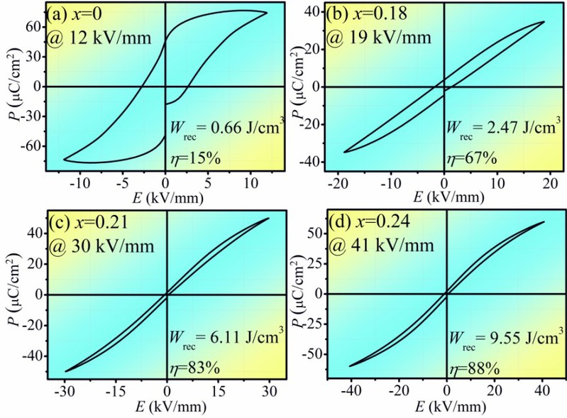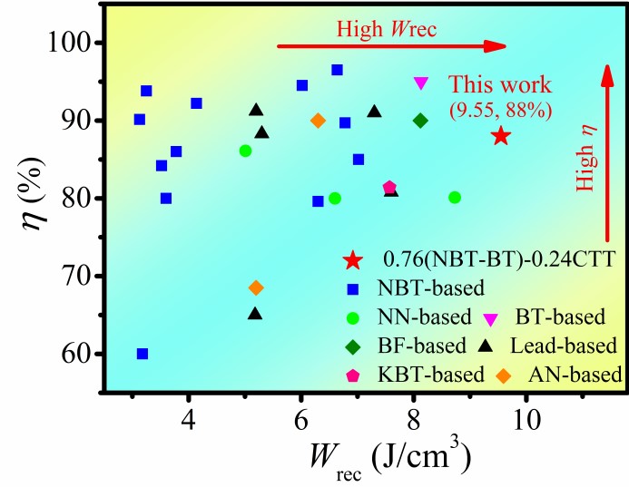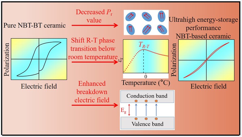 相较于锂电池、超级电容器等传统的电化学储能装置,介电储能陶瓷电容器因其具有较高的功率密度及快速充放电特点而备受关注。然而,陶瓷电容器材料的低能量密度(通常小于3 J/cm3)在很大程度上限制了其实际应用,且目前报道的大多数高储能陶瓷电容器材料都含有铅元素,对环境带来潜在危害。因此,如何通过材料设计有效提升无铅介质陶瓷电容器的储能特性已经成为该领域的研究热点。