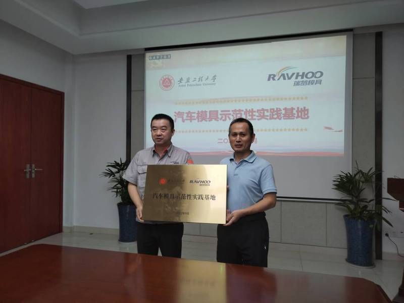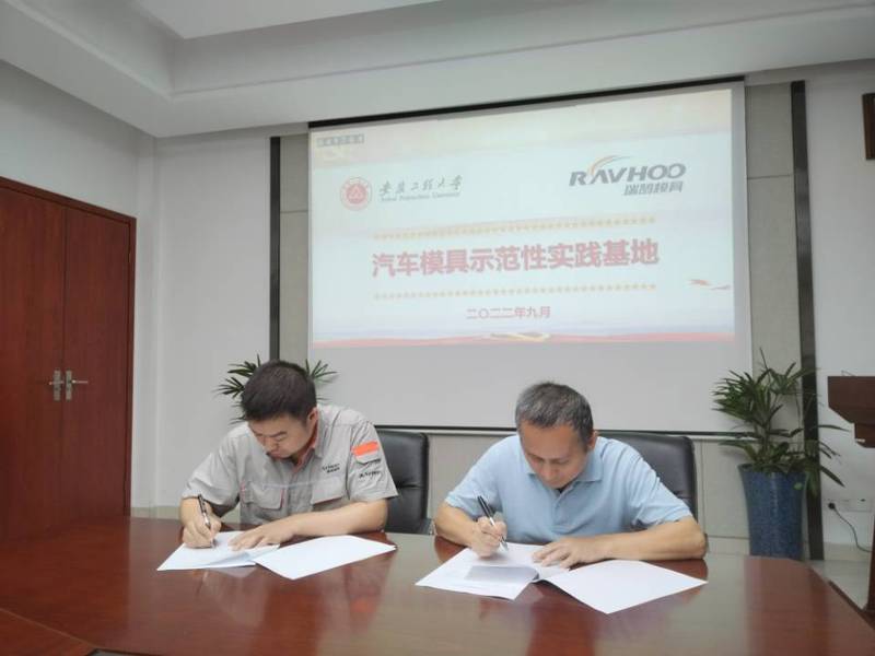 朱协彬与张锋代表校企双方为“汽车模具示范性实践教学基地”揭牌,签订《英国正版365官网与瑞鹄汽车模具共建“示范性实践就业教学基地”协议书》。
