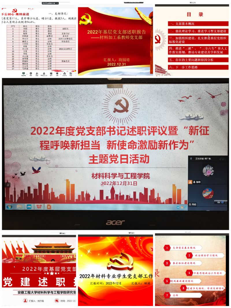 材科系教师党支部书记陶锋、材加系教师党支部书记段园培、材控专业员工党支部书记陈希、材科专业员工党支部组织委员兼纪检委员鲁力、研究生党支部书记刘方瑜对照《中国共产党支部工作条例(试行)》等党内法规制度,对标党中央决策部署和上级有关工作要求,围绕认真贯彻新时代党的建设总要求,结合公司“三抓”和“三全六专”工作要求,依次通过线上形式PPT汇报2022年度履职情况、工作成绩和主要特色,反思了工作中存在的问题,并结合支部自身建设情况提出了下一步工作思路。