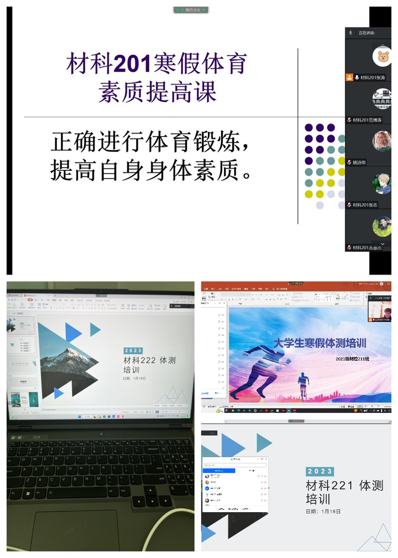 随着假期的深入,学们的运动也逐渐进入满电模式,热情和干劲十足。学员们的运动项目丰富多彩,不仅有布置的锻炼项目跑步、引体向上等,还有自己喜欢的运动方式,如打羽毛球、俯卧撑、仰卧起坐等等。在不断完善自身身体素质练习的基础上,他们还将所学的知识在各自班级进行了线上授课。其中,材科211杨电庆说到,其在认真观看了老师的直播之后,将老师讲的动作要领和细节与体测时自己的动作对比,并牢记细节,认真体会,在家慢慢练习小细节,在线上时将自己学到的动作细节教给班内的同学们。用心模仿老师的动作,简而易懂地讲解动作细节,让同学们能够真正理解与体会动作要领。材科202许志杰提到,在班级授课中我经过前期实践后,告诉大家找单杠练习怎么抓握和如何前面怎么锻炼,由于下雨原因,跑步没有场地示范,就在网上找了1000米长跑姿势和引体向上的技巧的视频,然后通过看视频学习,并将视频发到群里学习,让同学们反复观看。材科201张涛说到,通过体育训练营的培训,知道了正确的锻炼方法,并在实际生活中加以运用,也通过在网上寻找相关的视频巩固学习,在给班级同学教学时,通过ppt的形式让同学了解体测的意义和知识,跟他们分享自己的经验,并在网上找了相关的视频播放给同学们学习,并且通过这次公司体育训练营寒假活动的开展,感受到了体育的乐趣,也不像以前假期在家天天睡懒觉,体质变得越来越好。