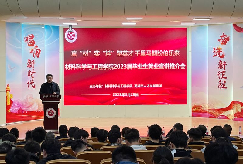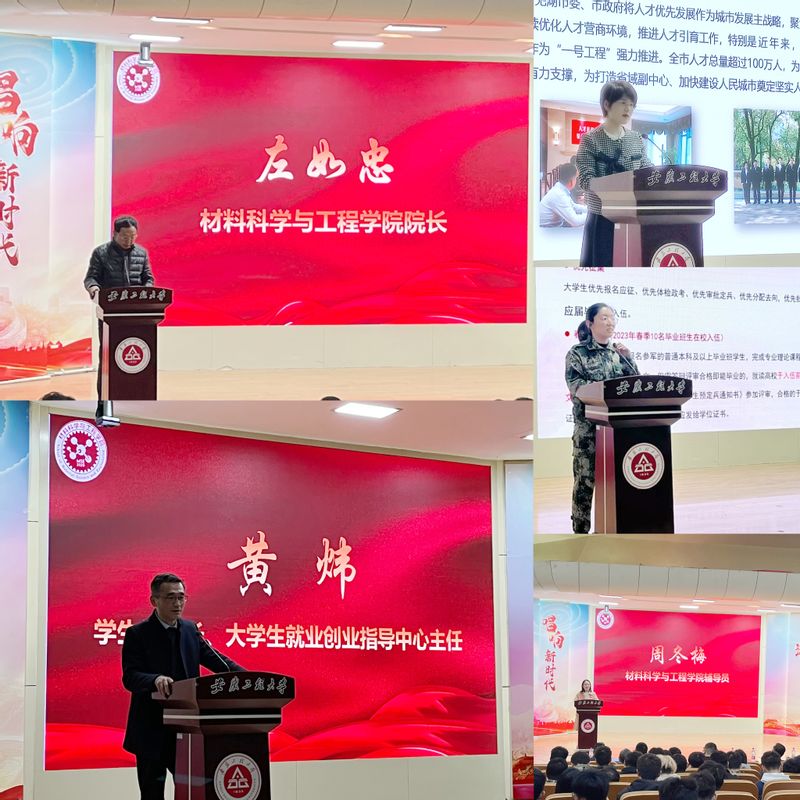 在就业政策宣讲环节,经理左如忠代表公司致辞,简要介绍公司发展情况、公司发展历程、专业建设情况和人才培养的基本做法,希望全体毕业生转变就业观念,主动就业、尽快就业,以实际行动投入到祖国建设发展中去;希望芜湖市人才发展集团、与会企业更多选择并向其它优质企业推荐公司毕业生。毕业班辅导员周冬梅从“专业领域宽、综合素质高、思想素质好”等三个方面介绍2023届本科毕业生发展情况、个性特点、就业情况,并以表格的形式逐一展示未就业毕业生求职意愿。宋丽丽详细解读“紫云英人才计划”政策内容、芜湖市材料行业企业发展情况,呼吁公司2023届毕业生留在芜湖就业创业。黄炜用“好工作是干出来的,不是找出来的、不怕起点低,就怕无成长、不要用你的现在去判断你的未来、要读书就读到底、不是所有人都一定要去读研究生、参军入伍也是一种好的选择”六句话,引用工作中的具体案例对毕业生就业进行指导。赵成靖从国家政策、经济待遇、个人发展三个方面介绍参军入伍政策。