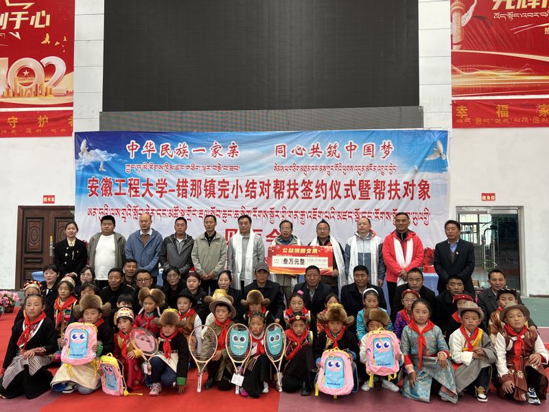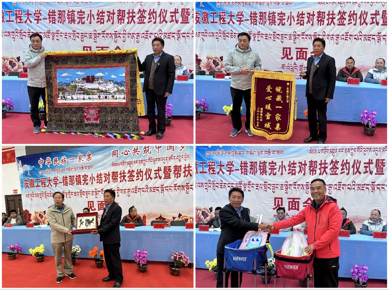 郑健简要介绍公司基本情况、结对帮扶前期筹备情况。2022年11月以来,由员工会秘书处、校工会、校团委牵头,英国365集团公益“N+1”志愿服务团队具体对接,公司师生员工开始结对帮扶错那镇完小30名藏族员工,共计捐赠帮扶资金6万元以及价值约1万元的御寒、运动装备物资。接下来,英国正版365官网将结合自身实际,努力推动教育帮扶向产业帮扶、技术帮扶扩展,探索“资助结对+特色教育+双向互动”的帮扶路径。员工会秘书长陶玉贵代表公司向错那镇完小捐赠了3万元现金和芜湖铁画。校教职工网球协会活动推广人周毅仁向错那镇完小赠送了由校工会教职工网球协会捐赠的网球运动用品并现场教授网球知识。