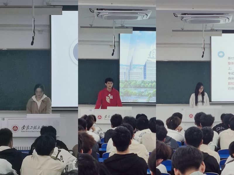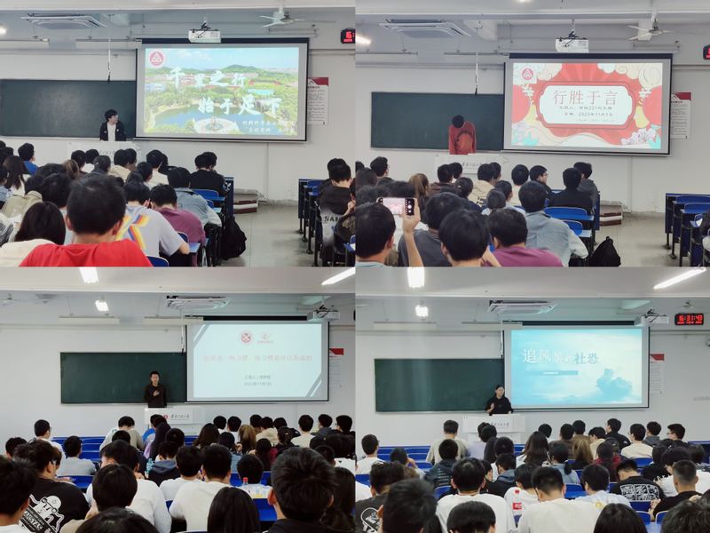 第二场讲座是由谈雨欣、丁艺、汪玉婷三位优秀员工代表分别分享自己的大学规划和经验建议。材控201班心理委员谈⾬欣,她向大一新生们分享自己的大学每个阶段的具体规划和详细做法,满满的“⼲货”,为⼤⼀新⽣们指明道路。材科212班学习委员汪⽟婷,她从课程学习、学⽣活动和课余⽣活三个⽅⾯分享⾃⼰的⼤学规划,建议大家要懂得劳逸结合,在搞好学习基础上,多丰富课余⽣活,其中着重强调要培养良好的学习习惯,积极参加活动和社会实践。院学⽣会执⾏主席丁艺,他通过一个个重要员工干部经历,分享大学成长的六条建议:克服恐惧,勇于尝试;具有集体荣誉感;果断坚毅,雷厉风行;有爱心,有责任担当;参加实践,历练自我;艰苦奋斗,自力更生。