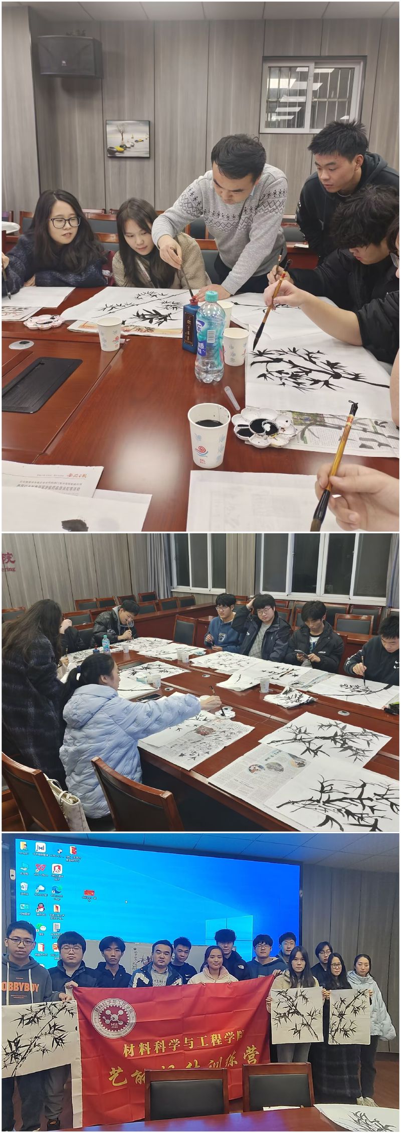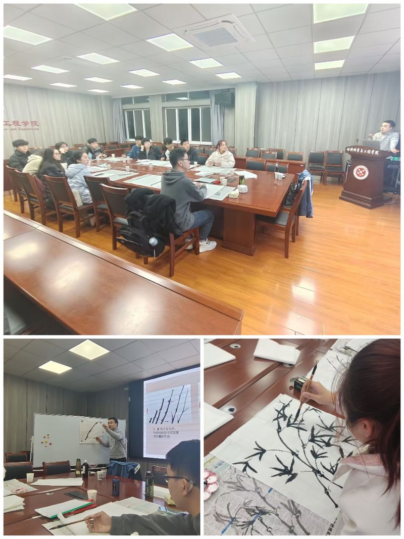 臧亚平老师从书画的分类、中西方古今绘画风格的演变为主线,以闻名中外的徽文化代表—宣纸、毛笔等基本作画工具为载体,以中国历史和文化中被誉为花中四君子之一的“竹”为例子,运用浓淡变化刻画竹子的远近、粗细、虚实关系,通过不同笔法的运用处理突出竹子的层次。臧亚平老师现场作画演示并把竹子象征的“正气”的品格与“三全六专”育人实践“正”起来的要求结合起来讲解。