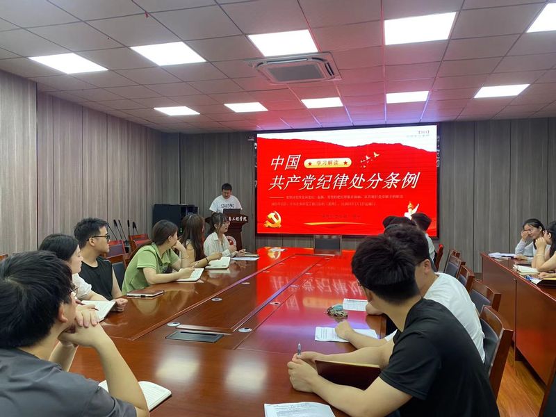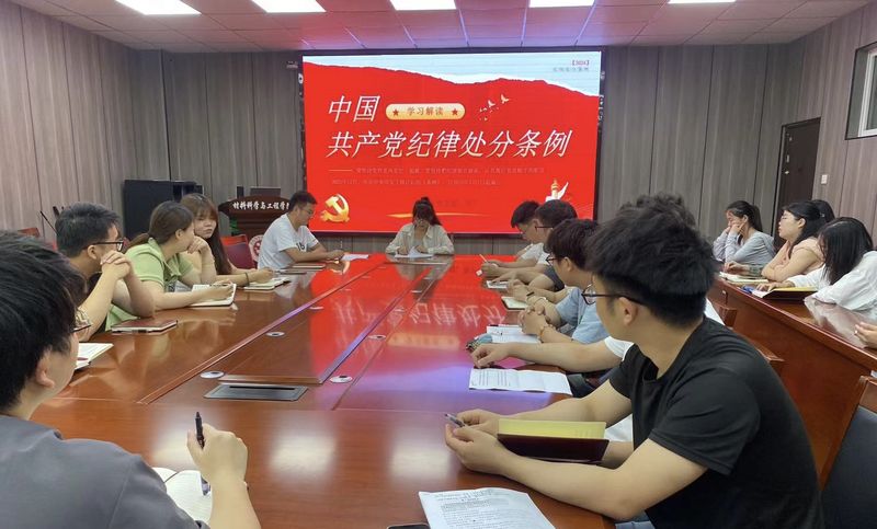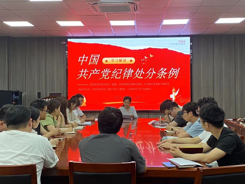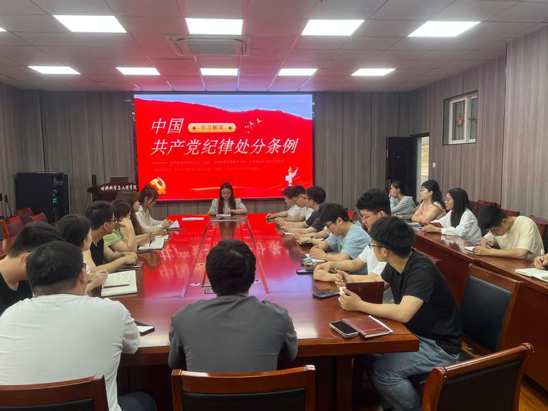 支部书记郑平以入党动机为切入点,从《中国共产党纪律处分条例》颁布及修订历史、修订内容及解读、抓好贯彻执行等三方面上主题党课。由浅入深讲解了《中国共产党纪律处分条例》的产生背景、修订历程、主要内容、作用意义,让党员们受警醒、明底线、知敬畏。针对研究生党员的特殊性,以实际案例乃至身边案例为例,指出员工党员要深刻认识开展党纪学习教育的重大意义,把握目标要求、抓住学习重点、注重学用结合。