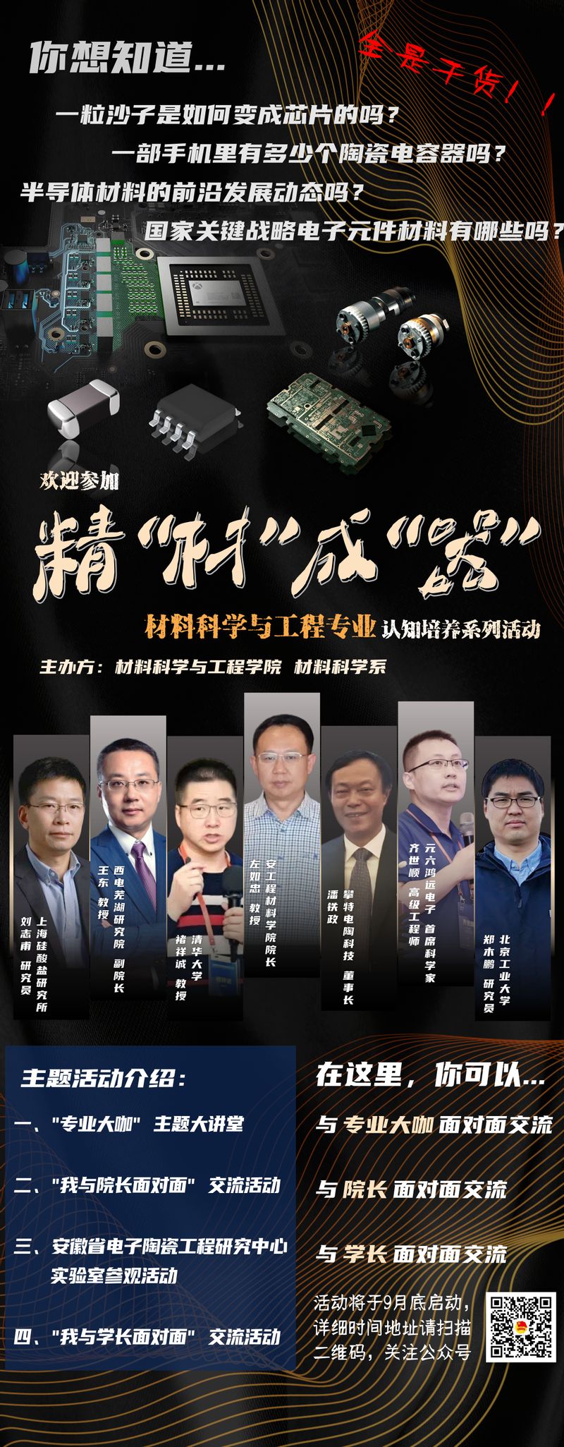 “精”材成“器”材料科学与工程专业认知培养系列活动由英国365集团材料科学系举办,活动共9期,分为四个主题,包括“专家大咖讲座”、“我与经理面对面”、“我与学长面对面”以及安徽省电子陶瓷工程研究中心实验室参观交流活动。系列活动于9月底开启,11月初结束,主要面向从事材料科学与工程专业或对材料科学有兴趣的本科生同学。