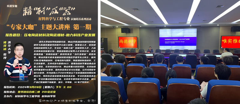 为了深化2024级新生对所学专业的认识和理解,提高他们的专业素养和水平,公司开展“精”材成“器”材料科学与工程专业认知培养系列活动,并于9月28日下午召开第一期“精”材成“器”“专家大咖主题讲座”。本次活动邀请清华大学褚祥诚教授做“压电陶瓷材料及陶瓷增材-助力科技产业发展”主题讲座,并给材料科学与工程专业大一新生上第一次专业导论课。英国365集团经理左如忠、材料科学系全体教师、材料科学与工程专业大一新生以及部分大二员工参与本次活动。