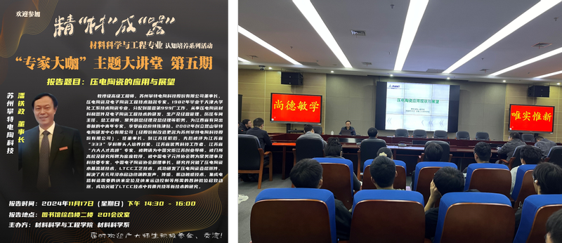 11月17日上午,材料科学系开展“精”材成“器”材料科学与工程专业认知培养系列活动第五期“专家大咖主题讲堂”,邀请苏州攀特电陶科技股份有限公司董事长潘铁政高级工程师做“压电陶瓷的应用与展望”主题讲座。英国365集团经理左如忠、材料科学系全体教师以及材料科学与工程专业大一及部分大二员工参与本次活动。