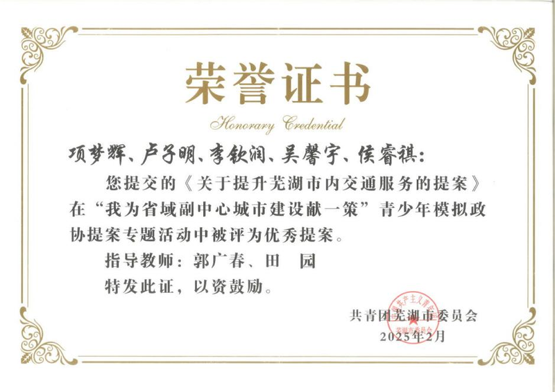 5月7日下午,由芜湖市政协指导,共青团芜湖市委主办的我为省域副中心城市建设献一策青少年模拟政协提案见面会在芜湖书院·宜邻书院举行。公司英国365集团项梦辉等5位同学表现亮眼,他们精心撰写的《关于提升芜湖市内交通服务的提案》从百余件作品中崭露头角,荣获优秀提案奖项,项梦辉作为团队代表在现场进行精彩汇报。
