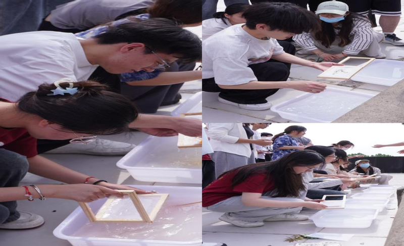 理论学习后,实践环节在阳台展开。同学们分组体验“抄纸-浇纸-晒纸” 流程,将苔藓、蕨类、花瓣等自然素材嵌入纸浆,创作 “植物标本宣纸”。清水拂过竹帘的沙沙声中,一张张融合春天气息的个性化宣纸逐渐成型。“原来造纸不是简单的‘搅拌’,力度和角度都会影响纸张的质感!”2023 级员工李雨桐捧着自己制作的花草宣纸感慨道。