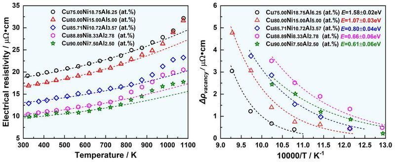 李胜彬系统研究了Cu-Ni-Al三元合金的微观组织演变规律及电阻率-温度变化规律。研究发现,该合金由γ相基体与羽毛状γ'共格析出相组成,室温条件下,随着Cu含量增加,羽毛状γ'相体积分数及尺寸不断减少。合金中(Ni+Al)含量越低,电子-电子散射作用和声子-电子散射作用越弱,室温电阻率越低。升温过程中,合金电阻率影响因素较为复杂,其受到理想晶格热振动、γ相溶质含量和高温热缺陷浓度共同影响。这项研究为设计高强度、高弹性和良好导电性能的Cu-Ni-Al导电合金提供了重要依据。
