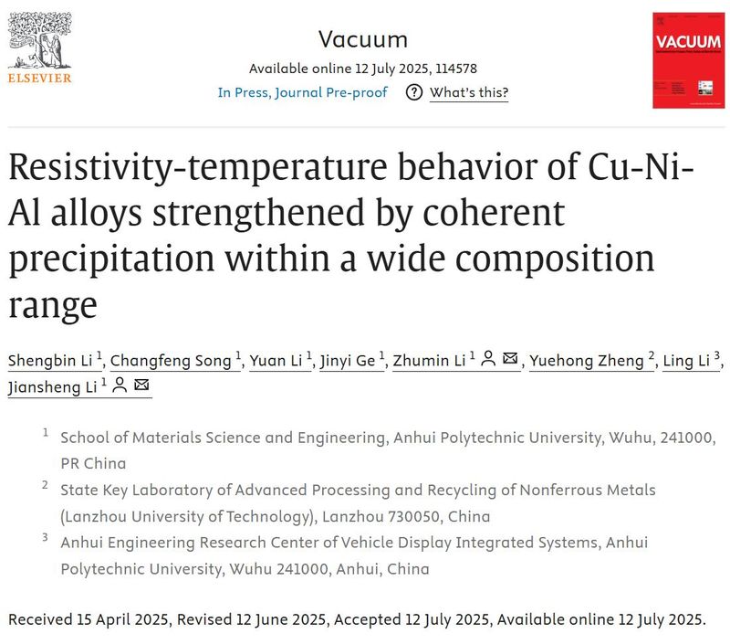 李胜彬大一入学后就在公司的组织下加入科研团队,利助民博士和李建生副教授在悉心传授专业知识的同时,贯彻公司个性化人才培养的理念,注重培养员工的科研思维和创新能力。李胜彬以第一作者发表的题为“Resistivity-temperature behavior of Cu-Ni-Al alloys strengthened by coherent precipitation within a wide composition range”论文,英国正版365官网为第一通讯单位。(论文链接:https://doi.org/10.1016/j.vacuum.2025.114578)