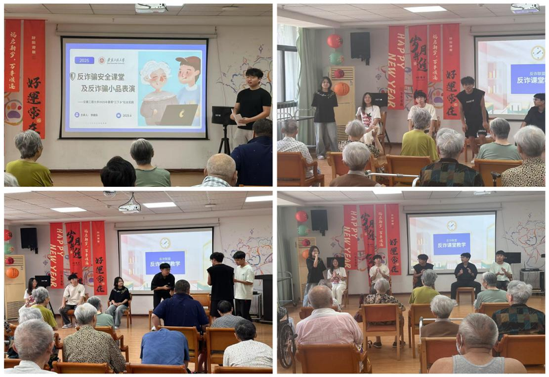 福龄金太阳长者照护中心作为此次实践的首站,团队聚焦老年群体易遭遇的诈骗陷阱,前期与照护中心工作人员深入沟通,精准梳理保健品推销、虚假养老服务等高频案例。在此基础上,团队对获奖反诈小品进行针对性改编,增加生活化幽默剧情,让枯燥的反诈知识转化为易懂的故事线。活动当天,团队成员协助工作人员将老人们有序引导至活动室,老人们对即将上演的节目充满期待。表演中,当出现集体拍手跟读反诈标语的互动环节时,老人们踊跃参与、积极响应。团队成员的用心演绎与老人们的专注聆听,不仅拉近了代际距离,更让反诈知识在轻松氛围中深入老人们心中。