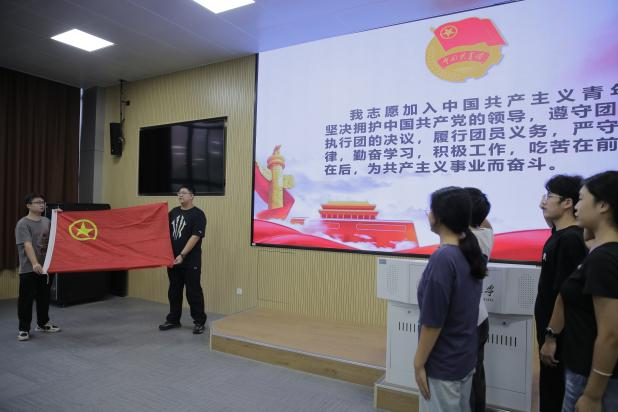 活动伊始,全体起立,奏唱国歌。王景芳宣读了2025年新发展团员名单,与会领导老师为新团员佩戴团徽。随后,在田园的领誓下,全体团员面向鲜艳的中国共产主义共青团团旗,高举右拳,进行入团宣誓和重温入团誓词。